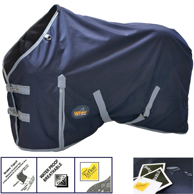 Coperta da paddock Winner non imbottita, tessuto esterno Ripstop impermeabile e traspirante con cuciture termosaldate, fodera interna in tessuto, doppia chiusura anteriore, cinghie incrociate, cinghie intercosciali staccabili, spacchi e copricoda.